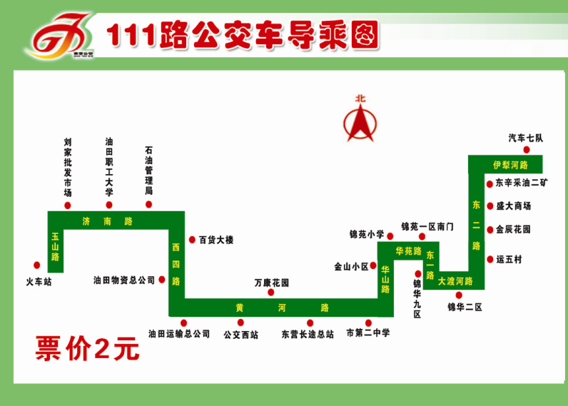 111路:該線路自汽車七隊始發(fā),經(jīng)伊犁河路(華瑞小區(qū))、東二路(盛大商場、運五村)、大渡河路(錦華五區(qū))、東一路(錦華九區(qū)),改經(jīng)華苑路(錦苑一區(qū)南門、錦苑小學)、華山路(金山小區(qū)),到達黃河路后,恢復(fù)原線路,單程里程24.3公里,票價、班次均不變。
