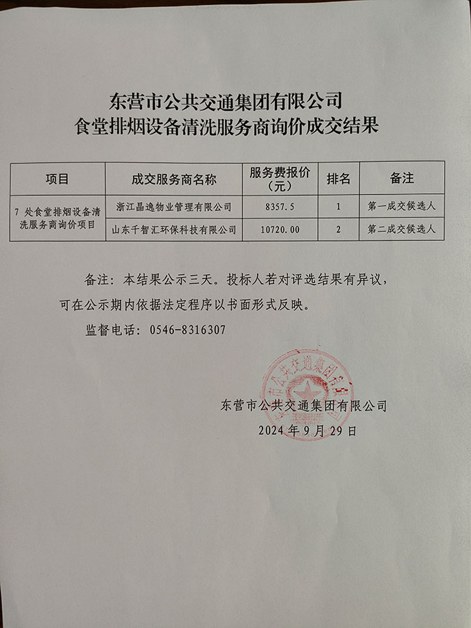 東營市公共交通集團有限公司食堂排煙設備清洗服務商詢價成交結果