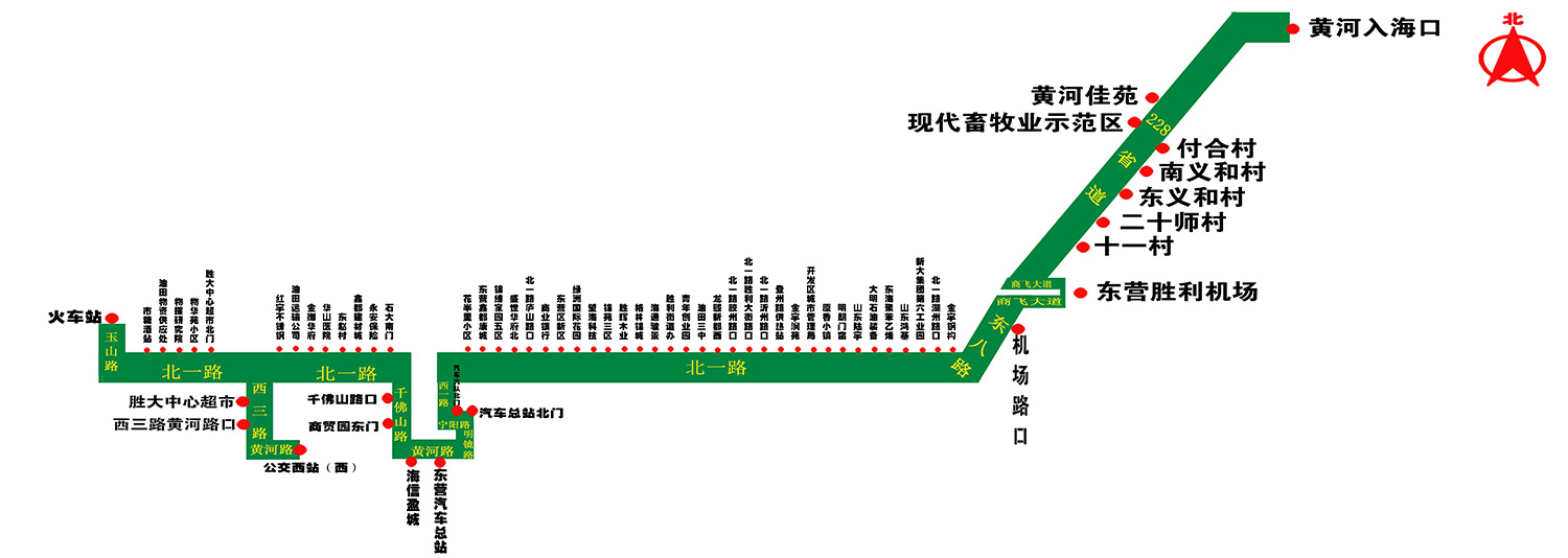 下行自公交西站始發,經黃河路、西三路、北一路、玉山路(火車站調頭)、北一路、千佛山路、黃河路、明鏡路、寧陽路、西一路、北一路、東八路、商飛大道(勝利機場調頭)、東八路、228省道、024鄉道到達終點站“黃河入海口”;上行按上述路線返回。