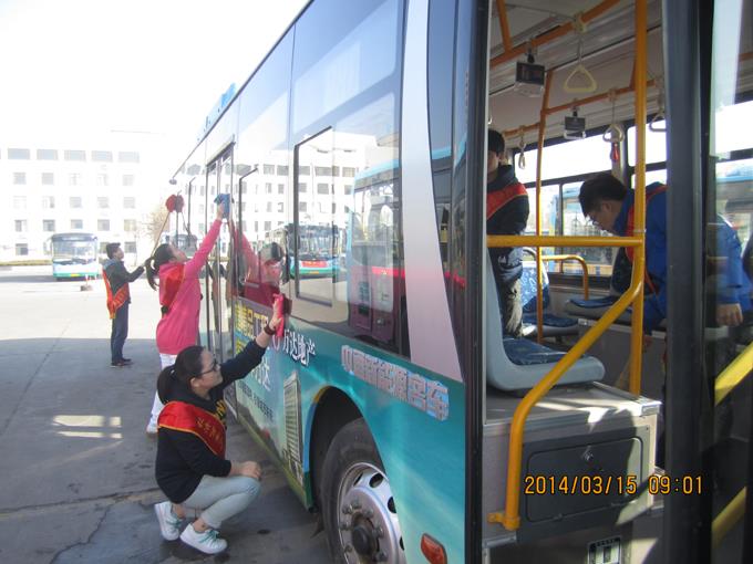 3月15日上午,市公交公司汽車(chē)一隊(duì)聯(lián)合東營(yíng)市職業(yè)學(xué)院開(kāi)展了學(xué)雷鋒活動(dòng)。來(lái)自該校經(jīng)濟(jì)貿(mào)易與管理學(xué)院的大學(xué)生和車(chē)隊(duì)職工共計(jì)28人,分兩個(gè)小組,一組乘坐公交車(chē)上路為特需乘客服務(wù),幫助疏導(dǎo)乘客;一組幫助駕駛員擦拭車(chē)身,清掃車(chē)廂衛(wèi)生。大家工作起來(lái)井然有序,有條不紊,尤其活躍在車(chē)廂為乘客服務(wù)的志愿者們,更是得到了乘客的一致好評(píng),成為公交車(chē)上一道亮麗的風(fēng)景。