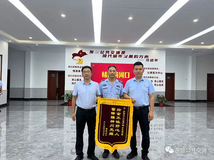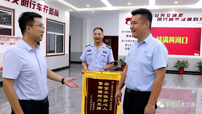 在7月10日下午,杜先生帶著“拾金不昧好心人,雷鋒精神閃光輝”的錦旗來到汽車一隊感謝車隊51路蘇文海師傅的拾金不昧。