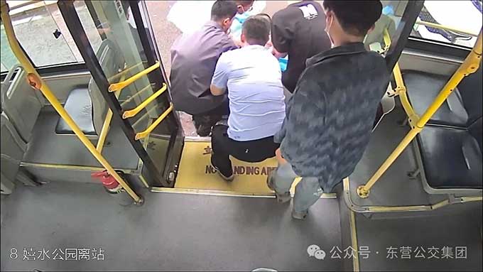6月2日晚高峰,東營(yíng)街頭車水馬龍。17時(shí)35分,8路公交駛離東趙大廈站,司機(jī)高希明從后視鏡發(fā)覺(jué)有些異常:一名剛換座的乘客低垂著頭,臉上也不正常,緊接著身體緩緩滑落在車廂地板上。