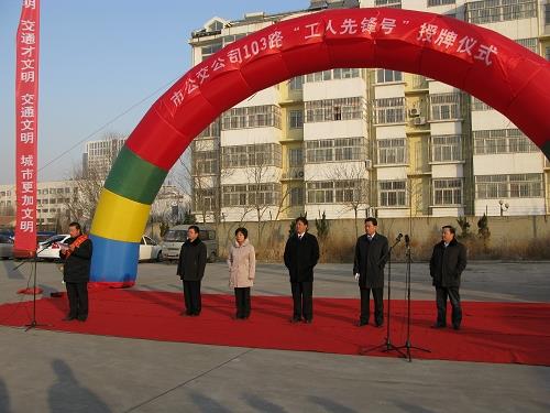 元月14日上午8:30分,市總工會、市交通局在市公交公司院內為市公交公司103路車組隆重舉行了市級“工人先鋒號”授牌儀式。市交通局黨委書記、局長李兆軍主持儀式,市總工會調研員王秀娥宣讀了表彰決定,市政協副主席、市總工會主席王少飛出席儀式并做了重要講話。