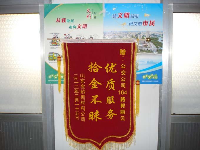 這位小伙子名叫燕同意,是山東金嶺新材料公司的一名職工,2012年2月15日上午,剛下了早班的燕同意乘坐8:40的164路返回東城,下車時將錢包落在了公交車上。跑回東城的駕駛員郭麗云在打掃車輛衛生時看到了一個棕色的牛皮錢包,里面3000多元現金,4張銀行卡,1張銀聯卡,1張身份證。面對鼓鼓的錢包,郭麗云第一時間將錢包交到了車隊。并與車隊工作人員一起通過包內的卡片多方聯系,在短短不到半個小時內便將錢包送到了失主的手中。小燕問駕駛員名字,郭麗云卻怎么也不肯告訴他。小燕通過多方打聽才知道了她的姓名。時隔多日,小燕帶著感激的心情送來了一面寫有“優質服務、拾金不昧”的錦旗。