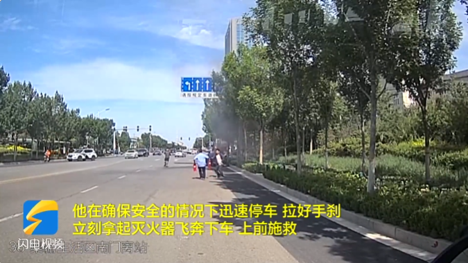 在菏澤路和西三路路口附近,看見前方有濃煙冒出,感覺就是著火了,把車停到路邊,拉好手剎,提著滅火器下去,幾分鐘就把火滅了。確認火勢得到控制后,李斌離開了現場,迅速返回到了他的工作崗位上。事后回憶起此事,他也表示這是他應該做的。